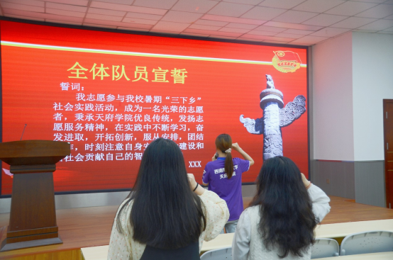 学生领誓人陈芮麟携全体志愿者宣誓,承诺在实践中秉承天府学院优良传统,发扬志愿服务精神,不断学习,奋发进取,开拓创新,服从安排,团结协作,时刻注意自身安全,为建设和谐社会贡献自己的智慧和力量。